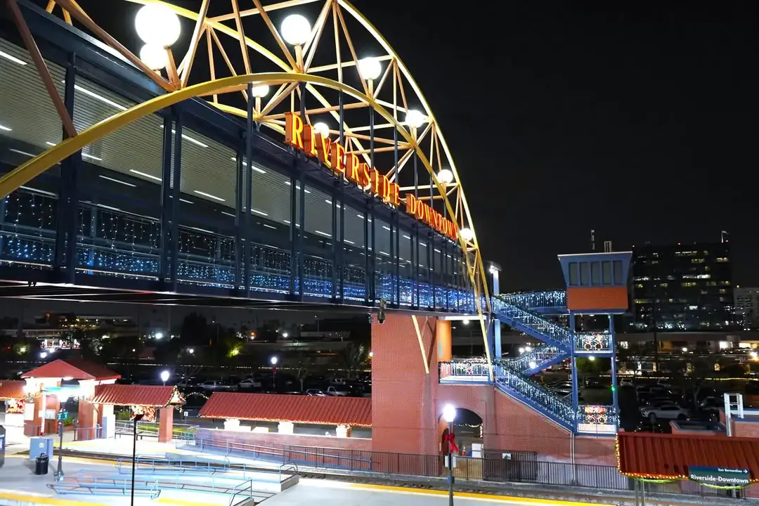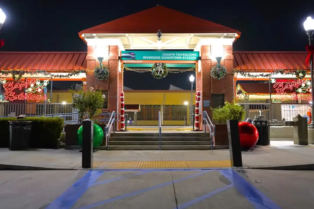 The Downtown Riverside Metrolink Station has regular service during the weekdays and weekends on the 91/Perris Valley, Inland Empire, Orange County, and Riverside Lines, and the early-morning trains and late-evening trains run between Los Angeles, Orange County, and San Bernardino.